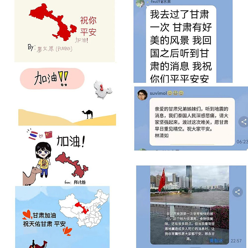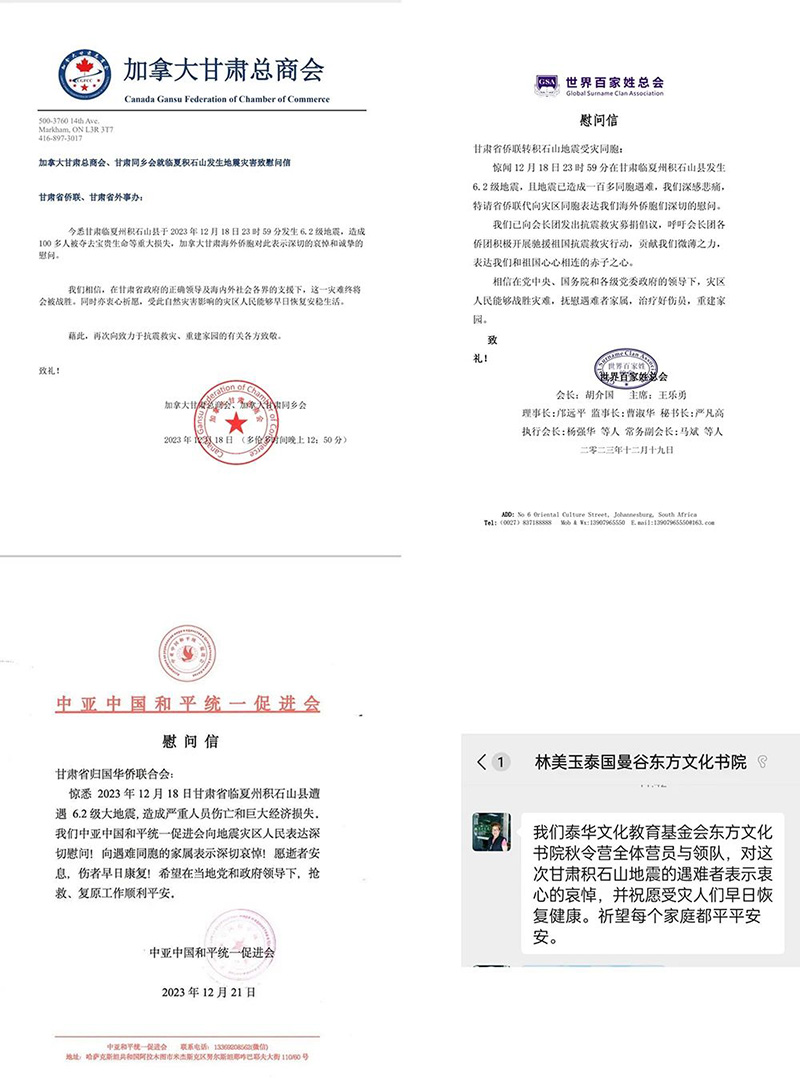 加拿大甘肃总商会、世界百家姓总会、中亚中国和平统一促进会和泰华文化教育基金会东方文化书院向省侨联发来慰问信,参加2023“中国寻根之旅”甘肃丝绸古道营的泰国华裔青少年们还通过自己的绘画作品和祝福短信祈福甘肃。