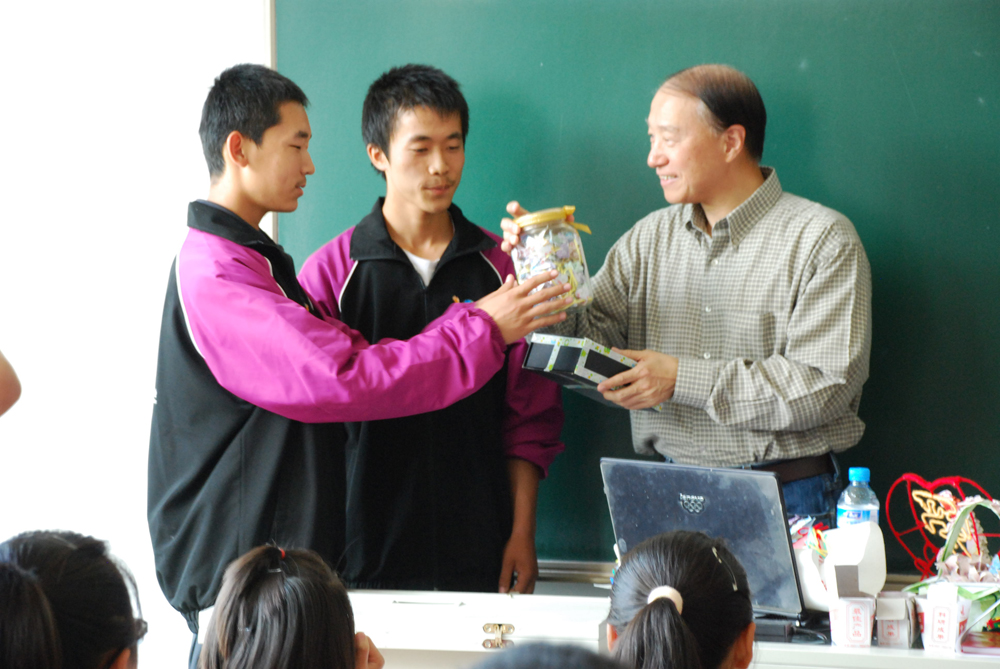 2011级“宪荣珍珠班”的捐助人孔毅先生接受”珍珠生”制作的小工艺品